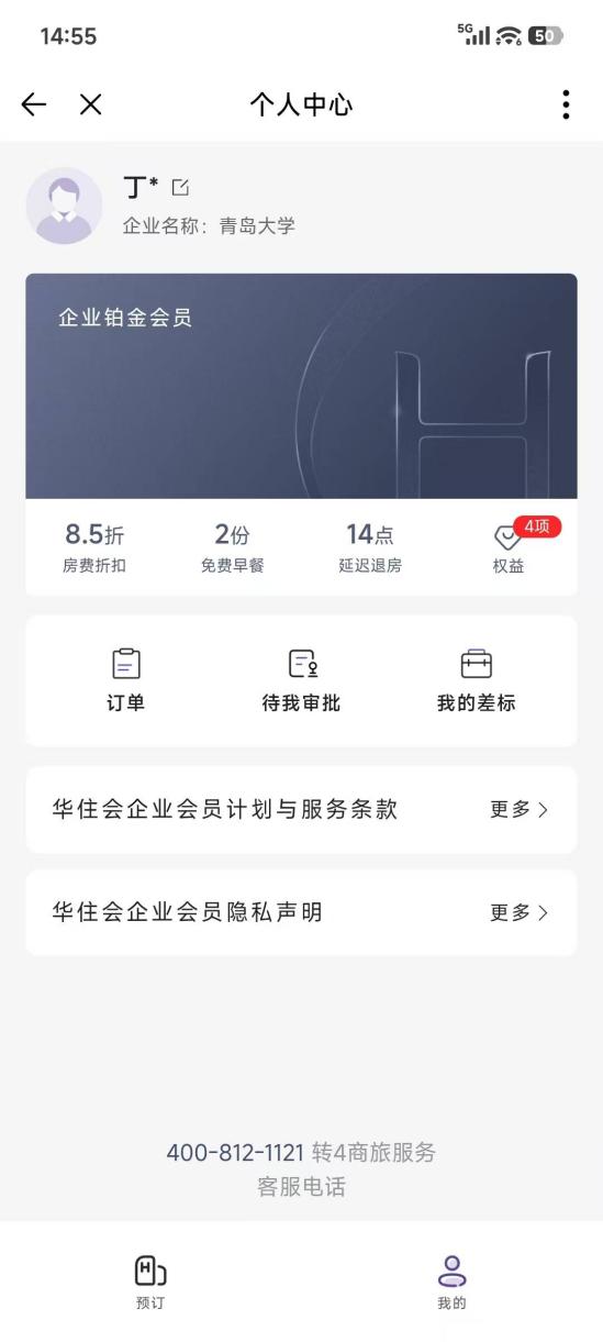 点击学校企业微信--工作台--生活服务--华住商旅,即可进入预定页面,预定即享华住会铂金会员权益。(首次进入需登记姓名及手机号等个人信息)提醒:如您已有华住会会员,请在本步骤输入华住会APP绑定的手机号,以便累计积分。